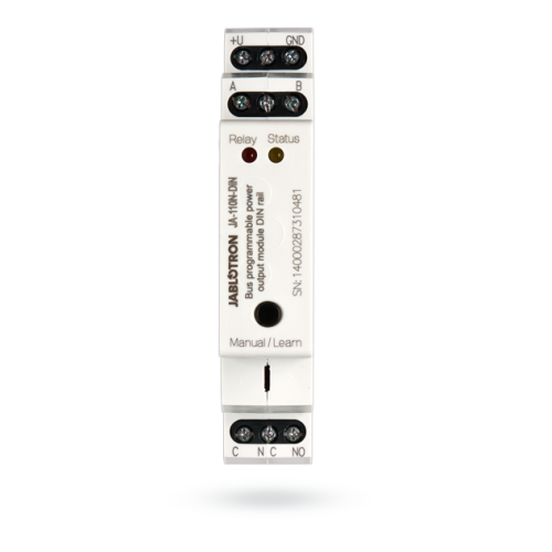 The JA-110N-DIN power output relay module PG have a switching relay (16 A/250V AC) with NO or NC terminals. It can be used for switching lighting, fans or appliances.